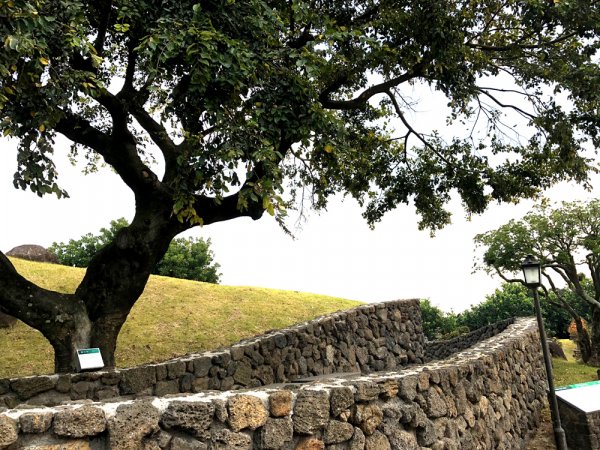 Chúng tôi đến với khu vườn vào một chiều thu với những tia nắng vàng nhảy nhót. Ấn tượng đầu tiên là bức tường đá bao bọc khu vườn. Đá là một trong những đặc trưng của đảo Jeju.