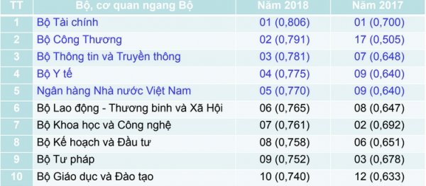 Theo báo cáo này, Bộ Tài chính tiếp tục giữ vị trí đứng đầu về chỉ số tổng thể mức độ ứng dụng CNTT của các bộ, cơ quan quan ngang bộ. Bộ Công Thương vươn lên vị trí thứ 2 và được coi là có tiến bộ vượt bậc so với vị trí thứ 17 của năm 2017. Đứng thứ 3 trong danh sách này là Bộ TTTT.