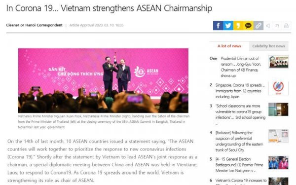 Năm 2020, Việt Nam đảm nhận vai trò kép khi vừa là Chủ tịch ASEAN vừa là Ủy viên không thường trực Hội đồng Bảo an Liên hợp quốc nhiệm kỳ 2020-2021. Việt Nam được kỳ vọng tạo được sự đồng thuận chung trong ASEAN đối với nhiều vấn đề khu vực và quốc tế, đồng thời nâng cao vai trò, tiếng nói của ASEAN trên trường quốc tế. Báo Asiatoday - một trong những tờ báo lớn của Hàn Quốc ngày 11/3/2020 đã đăng bài viết với nội dung đánh giá cao vai trò của Việt Nam đối với sự phát triển và đoàn kết của ASEAN, nhất là trong bối cảnh đại dịch Covid-19 đang lan rộng đến nhiều quốc gia trên thế giới. VOV xin giới thiệu nội dung bài báo trên: