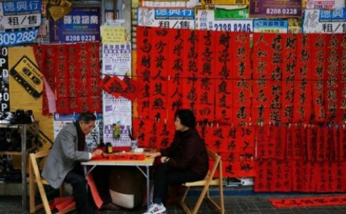 Một người viết thư pháp (trái) đang viết những chữ tốt lành trên giấy đỏ chào đón năm mới sắp đến, ảnh chụp ở Hồng Kong |