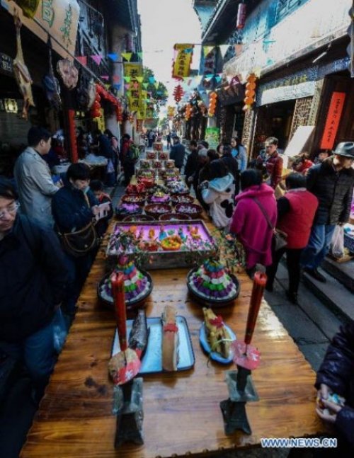 Du khách tham quan thực phẩm truyền thống đang trưng bày trên đường phố ở Tangqi Town |