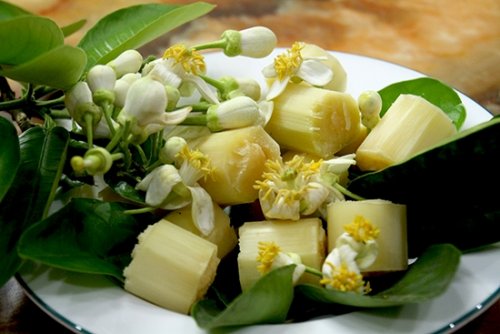 Không chỉ được dùng để ướp bột sắn dây, những bông hoa bưởi cũng được người dân ướp với mía tạo nên đồ uống thi vị không kém. Sau khi mua những cây mía về, tiện thành từng đốt nhỏ, bỏ vào túi nilong, đặt vài bông bưởi vào cùng rồi buộc kín lại. Chỉ để một lúc hương bưởi đã thấm vào những đốt mía, người ăn sẽ cảm nhận được vị ngọt của mía cùng vị thơm từ hoa bưởi nhẹ nhàng. Buổi trưa nắng nóng mà được những khúc mía nhỏ nhâm nhi, vừa ngọt vừa thơm thì còn gì thi vị bằng.