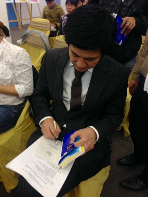 Anh "Chánh Văn" ký tặng sách cho độc giả tại Lễ ra mắt sách |